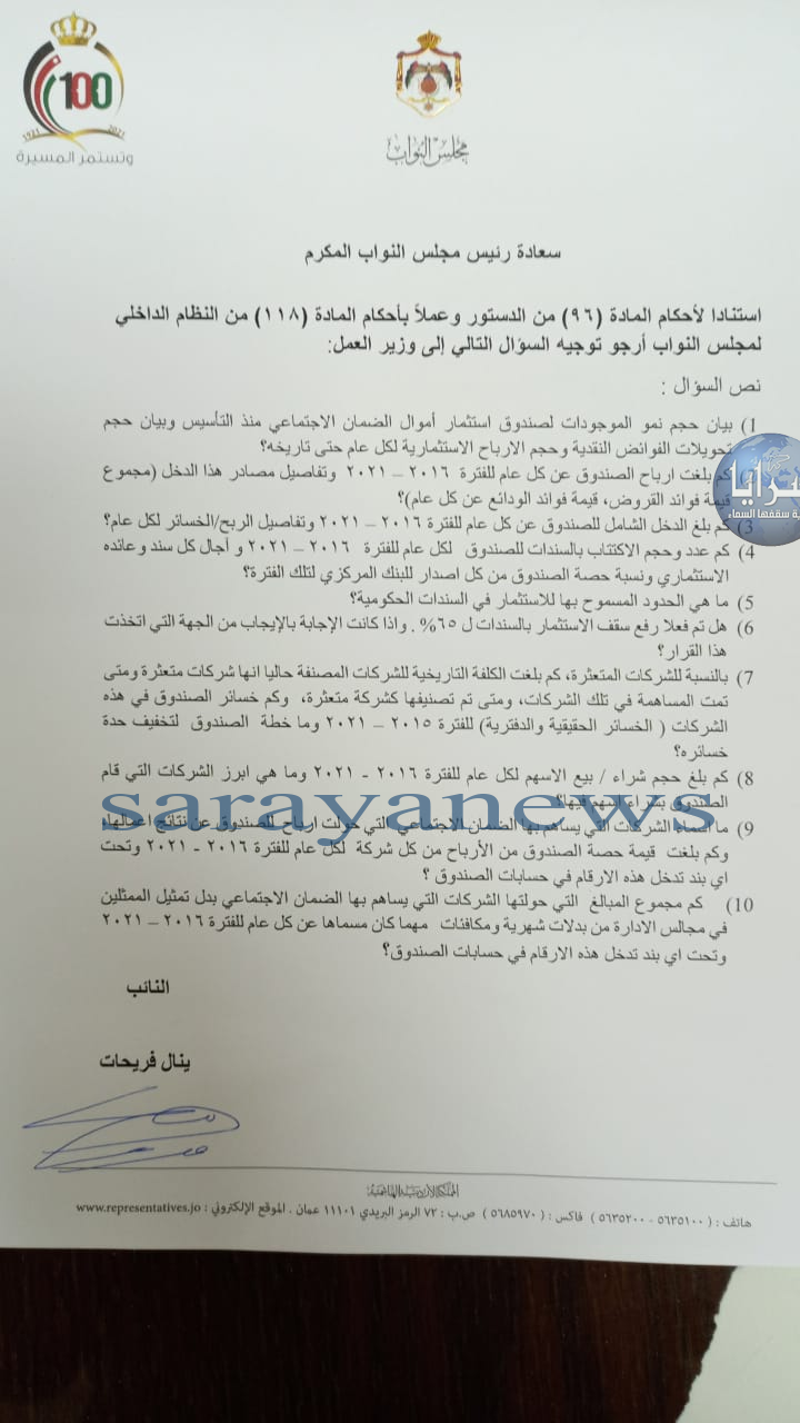 سرايا - طالب النائب ينال فريحات من خلال عدد من الأسئلة الى وزير العمل يوسف الشمالي عن موجودات صندوق استثمار أموال الضمان الاجتماعي وبيان حجم تحويلات الفوائض النقدية وحجم الأرباح الاستثمارية.