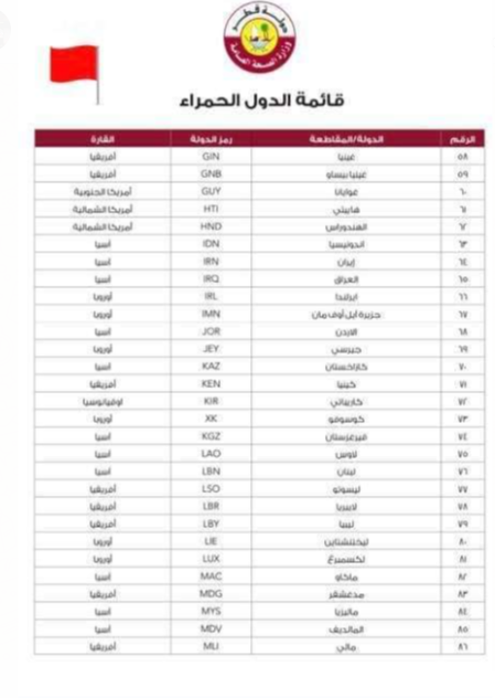 سرايا - أعادت دولة قطر إدراج الأردن على قائمة الدول الحمراء، وهي الدول الأكثر خطراً بسبب انتشار فيروس كورونا في تلك الدول.
