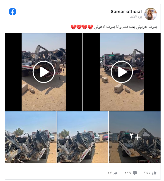 وقالت التحريات إن «السيارة انقلبت بالمطربة سمر واشتعلت بها النيران وتمكن الأهالي من إخراجها قبل احتراق السيارة بالكامل». وتسبب الحادث في تعطيل حركة المرور، ورفع رجال المرور آثار الحادث وقاموا بتسيير الحركة المرورية. وأصيبت المطربة بكسور في الذراع وشرخ في منطقة الظهر، وتخضع حاليا لإجراء عملية جراحية.