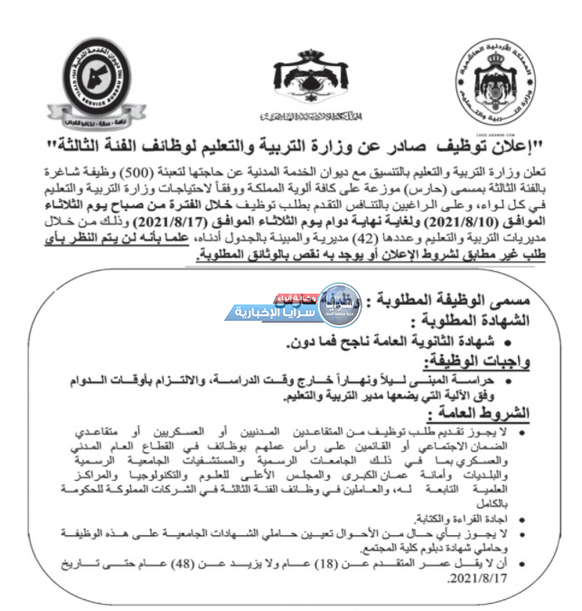 سرايا - أعلنت وزارة التربية والتعليم بالتنسيق مع ديوان الخدمة المدنية عن حاجتها لتعبئة 500 وظيفة شاغرة بالفئة الثالثة بمسمى (حارس) موزعة على كافة ألوية المملكة.