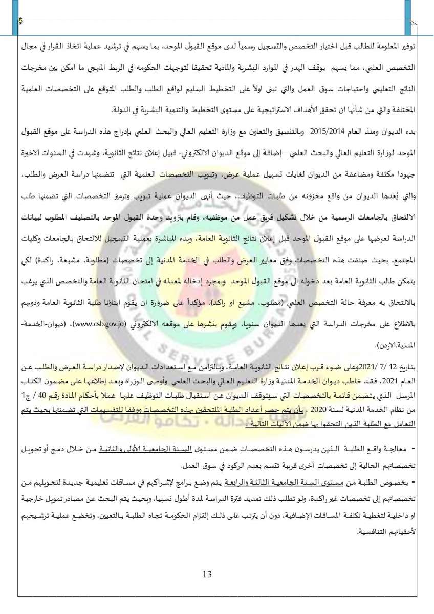 وقال رئيس الديوان سامح الناصر في تصريح إن الديوان يحرص بالتزامن مع إعلان نتائج الثانوية، على نشر مؤشرات دراسة واقع العرض والطلب على التخصصات العلمية المختلفة على موقعه الإلكتروني، وموقع القبول الموحد لوزارة التعليم العالي والبحث العلمي.