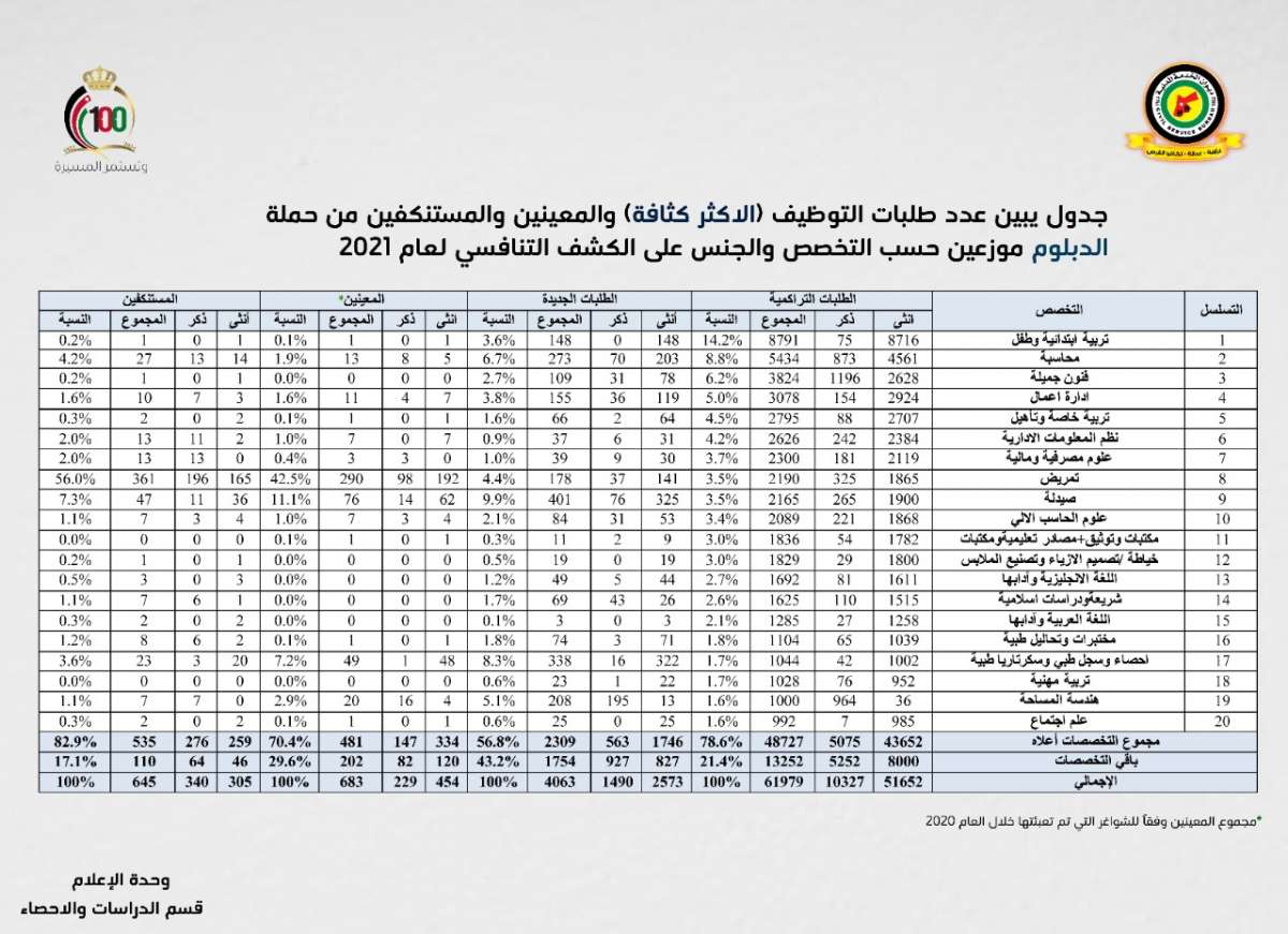 وبين الناصر ان وصول مجموع طلبات التوظيف لأكثر من 423 الفا، مؤشر واضح على ضرورة التوجه نحو التخصصات التقنية والمهنية والفنية، والابتعاد عن التخصصات الاكاديمية الإنسانية وخصوصا التعليمية، والابتعاد عن الثقافة المجتمعية السائدة نحو الوظيفة العامة، وضرورة الانتقال من مفهوم التوظيف الى مفهوم التشغيل في القطاعات غير الحكومية، وخصوصا في القطاع الخاص، نظرا لمحدودية قدرة القطاع العام على التوظيف، وانشاء المشاريع الصغيرة بالاستفادة من فرص التمويل التي توفرها صناديق الإقراض الحكومي، بشروط ميسرة دعما لمفهوم ريادة الاعمال.