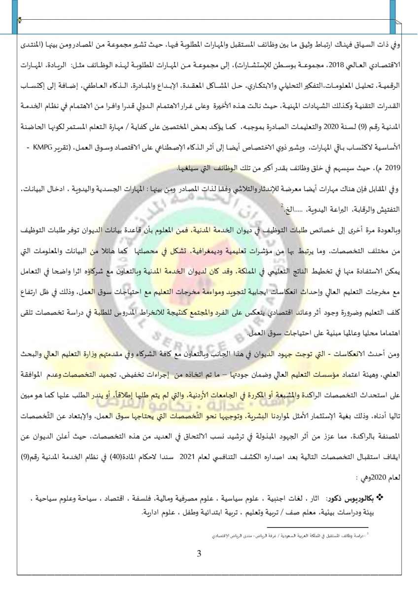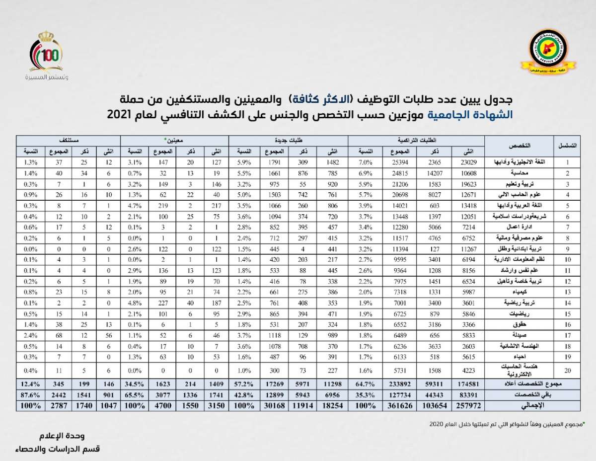 ولفت إلى أن "دراسة منهجية سنوية يعدها الديوان تبين واقع عملية العرض والطلب على مختلف التخصصات العلمية، وهذه الدراسة شاملة متكاملة وموزعة على المناطق الجغرافية من ألوية ومحافظات والنوع الاجتماعي وحسب المؤهلات العلمية سواء كانوا جامعيين أو دبلوم وأيضا تبين توزيعها على مستوى التخصصات وهو الشيء المهم والنوعي”.