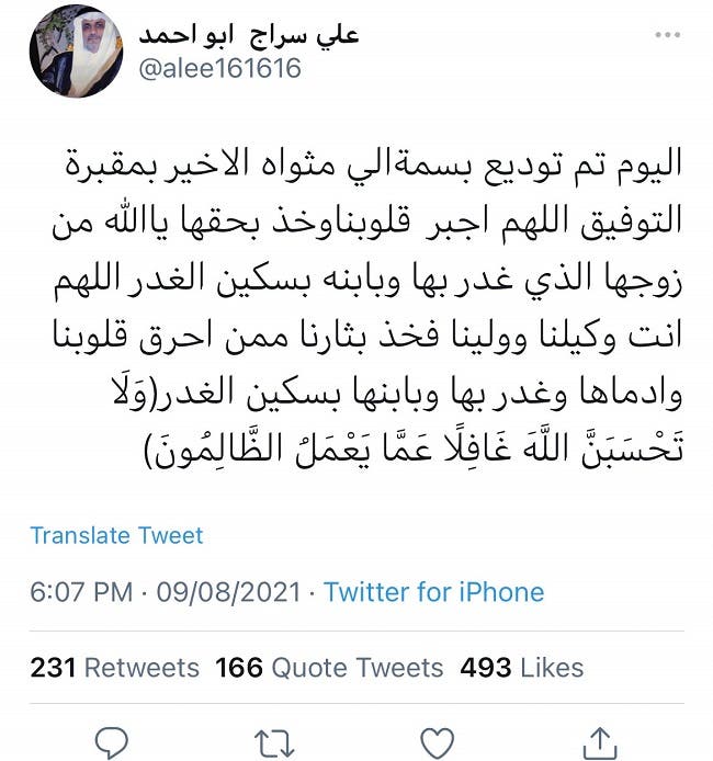 وقال في تغريدة نشرها في اليوم التالي: "اليوم تم توديع بسمة إلى مثواها الأخير بمقبرة التوفيق، اللهم اجبر قلوبنا وخذ بحقها يالله من زوجها الذي غدر بها وبابنها بسكين، اللهم أنت وكيلنا فخذ بحقنا ممن حرق قلبنا وأدمها وغدر بها وبابنها بسكين الغدر(ولا تحسبن الله غافلًا عما يعمل الظالمون)".
