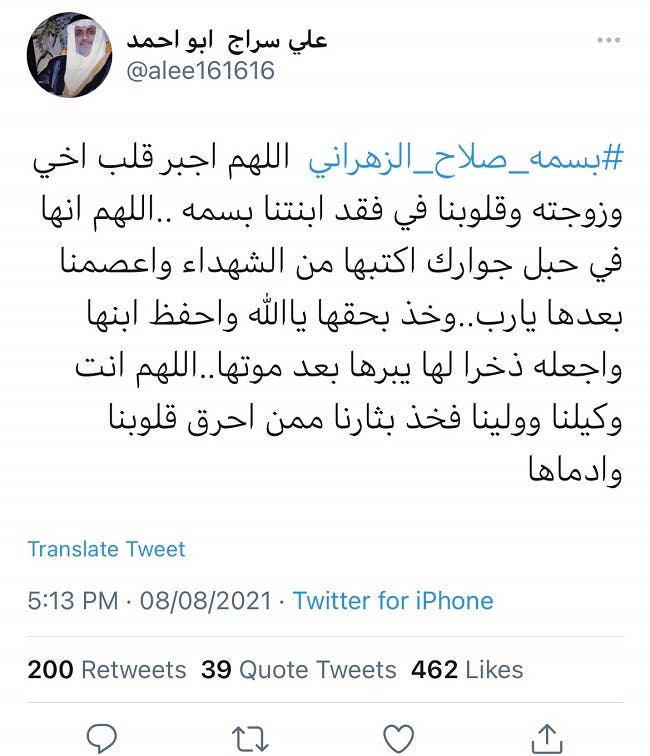 وكان عم بسمة صلاح الزهراني، علي سراج أبو أحمد، نعى ابنة أخيه بتغريدة مؤلمة كتبها بتاريخ 8 أغسطس الجاري قال فيها: "اللهم أجبر قلب أخي وزوجته وقلوبنا في فقد ابنتنا سمة، اللهم إنها في حبل جوارك اُكتبها من الشهداء واعصمنا بعدها يا رب".
