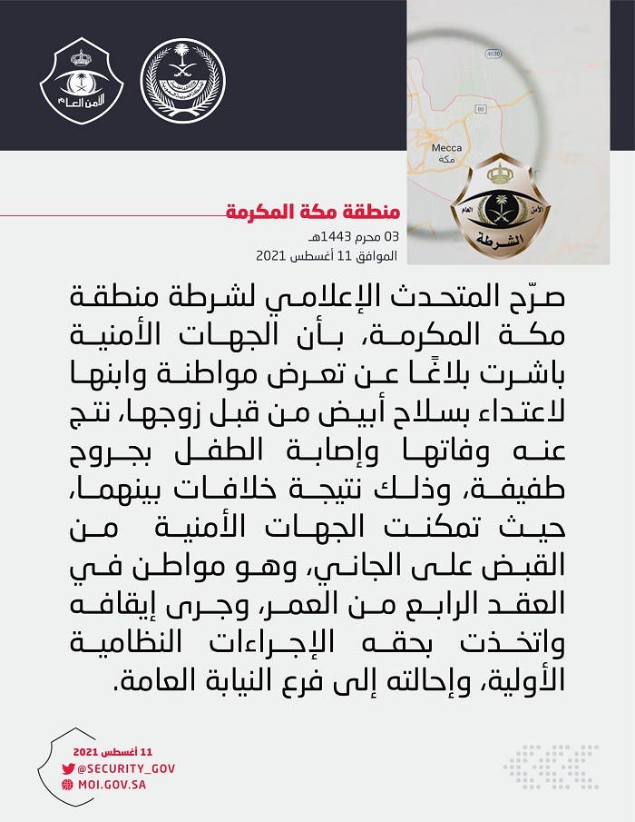 من جهته صرح المتحدث الإعلامي لشرطة منطقة مكة المكرمة بأن الجهات الأمنية باشرت بلاغًا عن تعرض مواطنة وابنها لاعتداء بسلاح أبيض من قبل زوجها نتج عنه وفاتها وإصابة الطفل بجروح طفيفة، وذلك نتيجة خلافات بينهما حيث تمكنت الجهات الأمنية من القبض على الجاني وهو مواطن في العقد الرابع من عمل وجرى إيقافه واتخذت بحقه الإجراءات النظامية الأولية وإحالته إلى النيابة العامة.