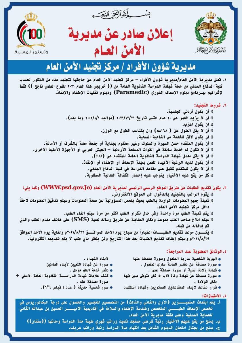سرايا - اعلنت مديرية الأمن العام / مديرية شؤون الأفراد عن حاجتها لتجنيد عدد من الذكور لحساب كلية الدفاع المدني وفق الشروط المبينة في الإعلان أدناه.