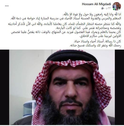 وأضاف: "كان يحببنا بالعلم ويحرك فينا الفضول فيزيد عن المنهاج، بالوقت ذاته يقصُّ علينا قصص الاولين ليربينا على مكارم الاخلاق.. كان ذا رسالة، أستاذ أحياء واستاذ حياة.. رحمك الله وغفر لك واسكنك فسيح جناته.