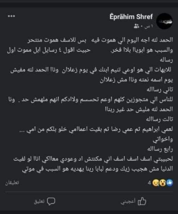 وقد طالب في منشوره الأخير على "فيسبوك" الآباء بـ"معاملة أبنائهم معاملة حسنة"، متهماً والده بالتسبب في وفاته ودفعه إلى الموت منتحراً. وكما طالب أعمامه برعاية والدته وأشقائه.