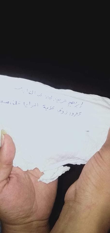 وتبيّن من الرسالة أن الشاب يدعى إبراهيم شريف الباز، ويبلغ من العمر 18 عاماً. وبإجراء التحريات حوله، تبيّن أن خلافات بينه وبين والده دفعته لاتخاذ قراره بالانتحار.