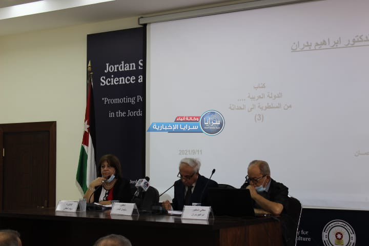 سرايا - أقامت الجمعية الأردنية للعلوم والثقافة بحضور الوزير الأسبق سمير الحباشنة رئيس الجمعية وجمع غفير من الأعضاء والأصدقاء حفلا لتوقيع الوزير الأسبق د. ابراهيم بدران كتابه "الدولة العربية من السلطوية الى الحداثة "حيث قدمت الحفل د. سهام الخفش عضو الجمعية كما فدم د. سليمان البدور عضو الهيئة الإدارية للجمعية قراءة نقدية مفصلة تحدث خلالها عن السلطة في التاريخ العربي وتحدياتها وتحولاتها وما قدمته الأنظمة المتقلبة على الدولة العربية والتحديات التي واجهتها أمام شعوبها .