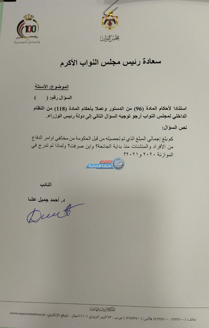 سرايا - تسائل النائب أحمد عشا خلال سؤال وجهه لرئيس الوزراء عن إجمالي المبلغ الذي تم تحصيله من قبل الحكومة من مخالفي أوامر الدفاع من الأفراد والمنشآت منذ بداية الجائحة.