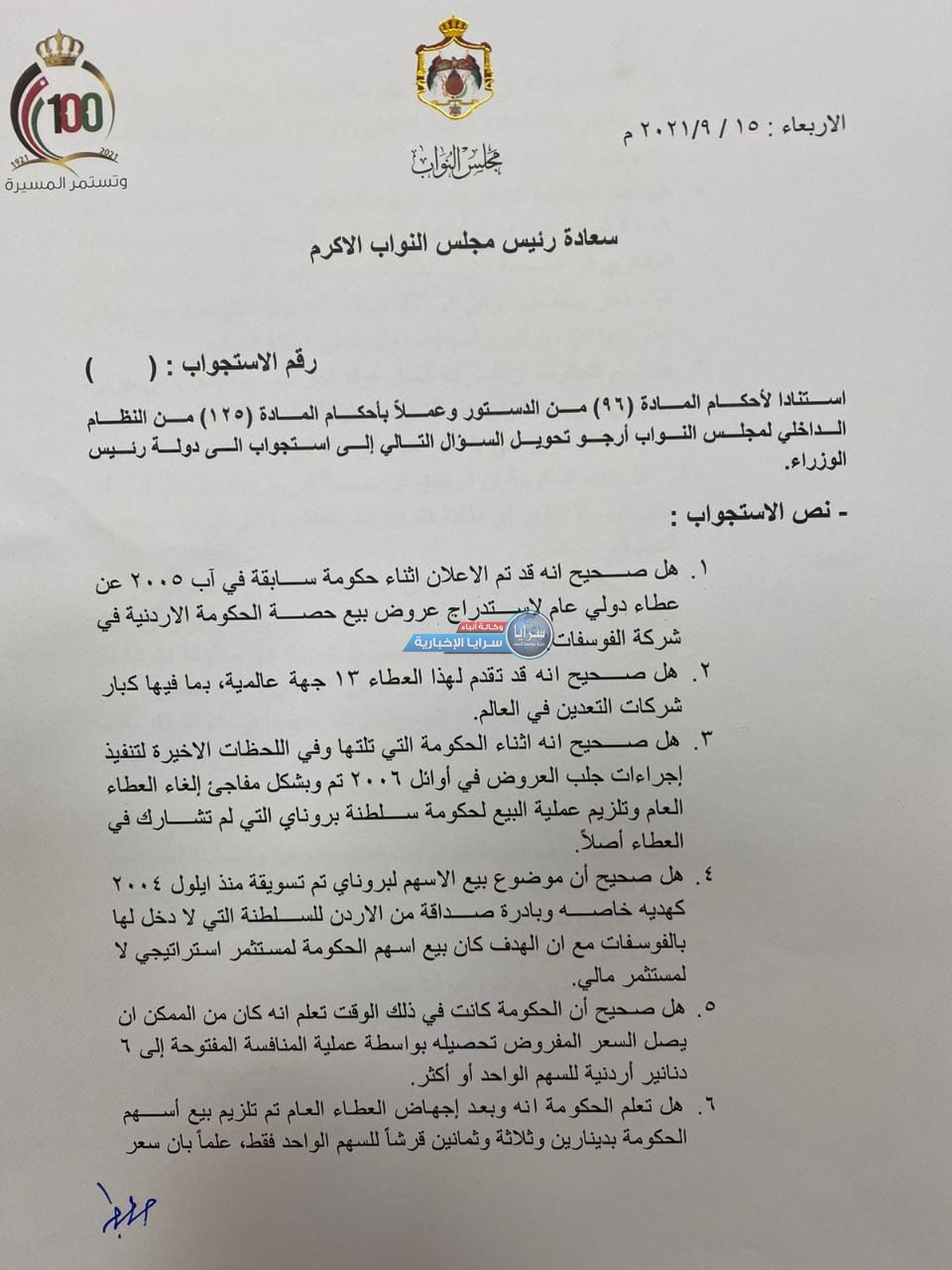 6. هل تعلم الحكومة انه وبعد إجهاض العطاء العام تم تلزيم بيع أسهم الحكومة بدينارين وثلاثة وثمانين قرشاً للسهم الواحد فقط، علماً بان سعر الاقفال في سوق عمان المالي في اخر يوم تداول قبل البيع كان اربعه دنانير وعشرون قرشاً لسهم شركة الفوسفات.