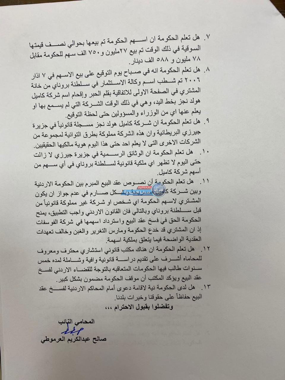 12. هل تعلم الحكومة ان هناك مكتب قانوني استشاري محترف ومعروف للمحاماه أشرف على تقديم دراسة قانونية وافية وشاملة لمده خمس سنوات طالب فيها الحكومات المتعاقبه بالتوجة للقضاء الاردني لفسخ عقد البيع ويؤكد المكتب أن موقف الحكومة مضمون بشكل كبير.