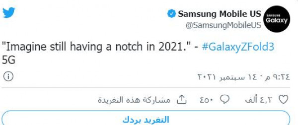 وأرفقت "سامسونغ" في تغريداتها هاشتاغ أحدث هواتفها الذكية "غلاكسي زد فولد 3"، الذي يأتي بشاشة عرض كاملة، بفضل تقنية الكاميرا أسفل شاشة الهاتف.