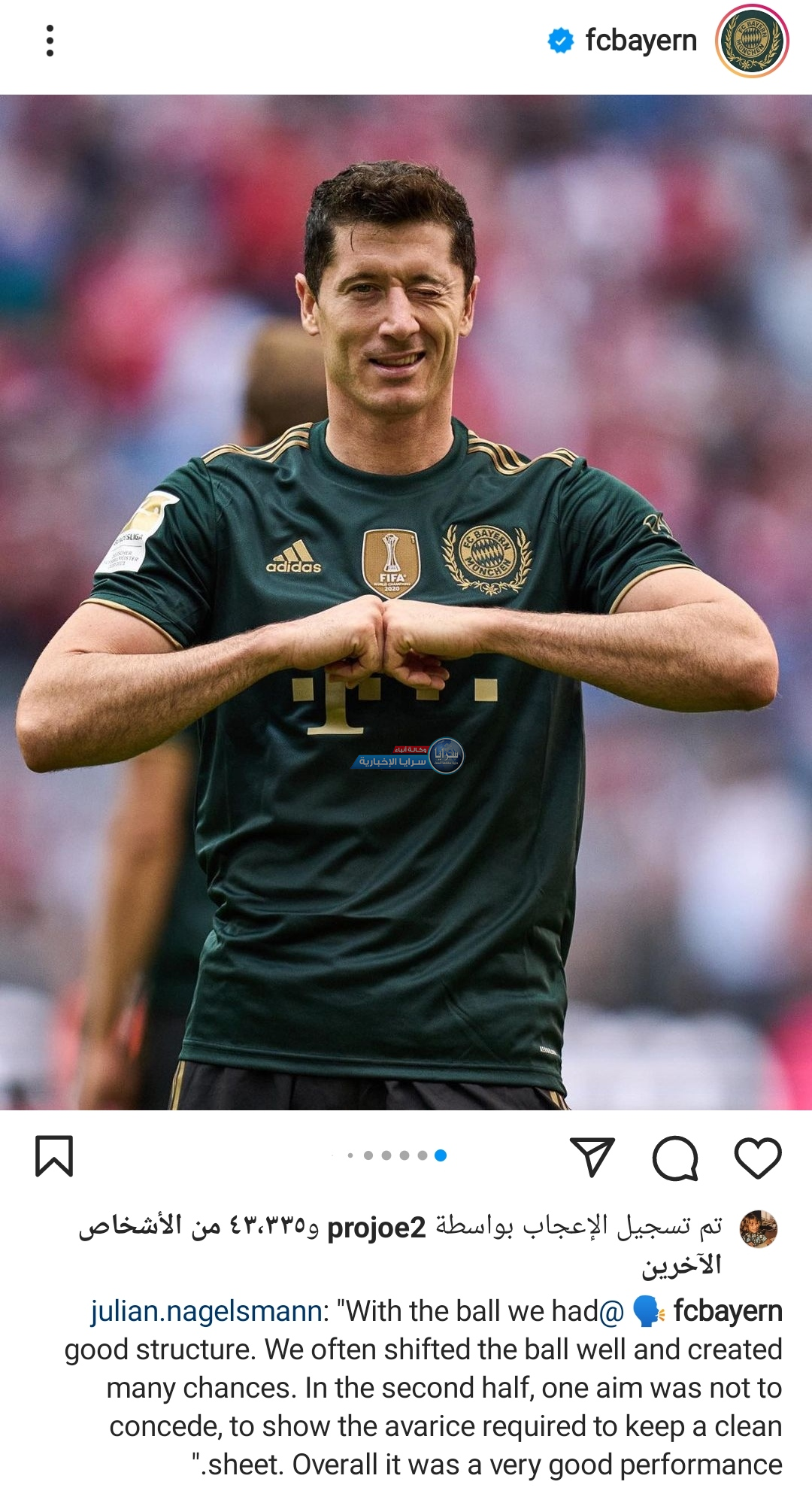 ونشر الحساب الرسمي للبايرن على موقع "إنستجرام"، مجموعة صور من احتفال لاعبيه فى أرض الملعب، وعلق عليها: "لدينا لاعبين جيدين.. صنعنا العديد من الفرص.. فى الشوط الثانى كان أحد الأهداف هو عدم التنازل لإظهار الجشع المطلوب للحفاظ على ورقة نظيفة.. وبشكل عام كان الأداء جيدًا جدًا".