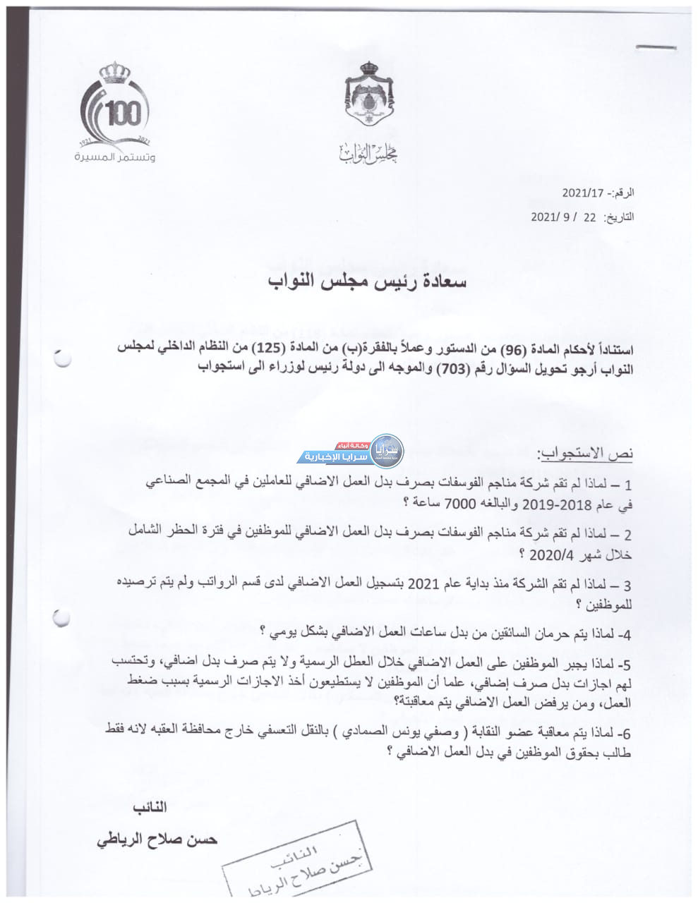 سرايا - حول النائب حسن صلاح الرياطي سؤاله للحكومة حول شركة مناجم الفوسفات الى استجواب، وتضمنت الاسئلة النيابية الموجهة للحكومة بعدم قيام شركة مناجم الفوسفات بصرف بدل العمل الاضافي للعاملين في المجمع الصناعي ومنها ايضا لماذا يجبر الموظفين على العمل الاضافي خلال العطل الرسمية ؟.