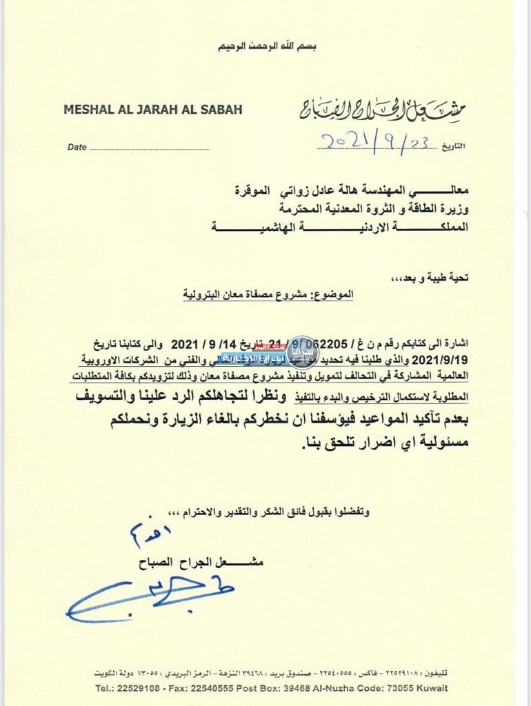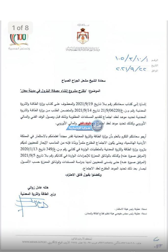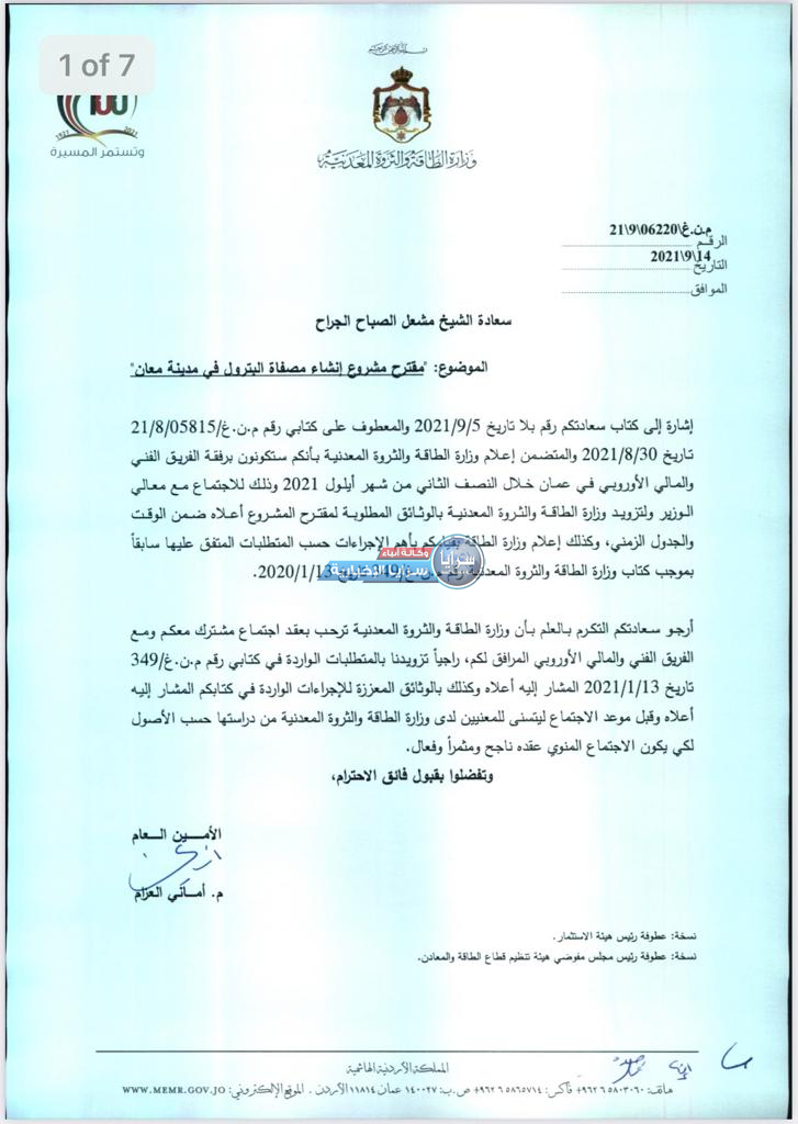 واضافت انه بتاريخ 13 أيلول 2019 قام الشيخ مشعل، بتزويد وزارة الطاقة بدراسة جدوى اقتصادية أولية، وبعد سلسلة من اللقاءات والمراسلات تم اعلامه بتاريخ 13 كانون الثاني من عام 2020 بانه لا يوجد ما يمنع لدى الوزارة من فتح مجال الاستثمار في مشروع إنشاء مصفاة بترول جديدة في مدينة معان وفقاً للآلية الموافق عليها من قبل مجلس الوزراء ووفقا للاشتراطات والمتطلبات الواردة في كتاب الموافقة المبدئية، وعلى ان يلتزم المستثمر بالجدول الزمني الذي كان قد تقدم به في دراسة الجدوى الاقتصادية الأولية والذي تم تحديده ايضا في كتاب وزارة الطاقة.