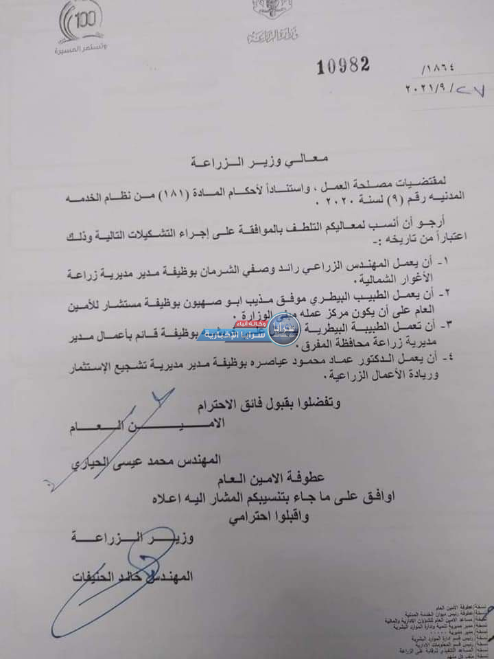 سرايا - أجرى وزير الزراعة المهندس خالد الحنيفات، اليوم الإثنين، تشكيلات إدارية جديدة شملت تكليف عدد من الموظفين لإدارة مديريات الزراعة بالمحافظات ومستشار للأمين العام في مبنى الوزارة.وجاءت التشكيلات كما يلي: