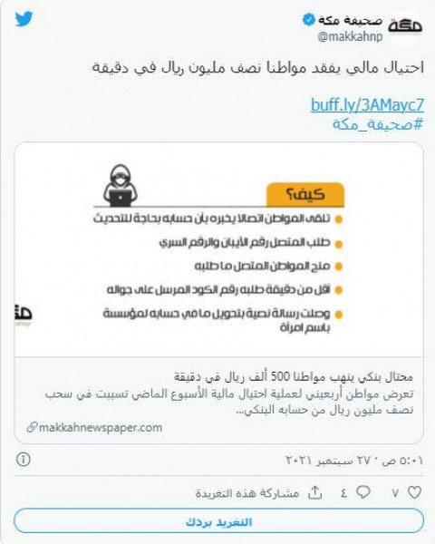 سرايا - كشف مواطن سعودي عن تعرضه لعملية احتيال مالي تسببت في خسارته نصف مليون ريال من حسابه البنكي في أحد المصارف المحلية.