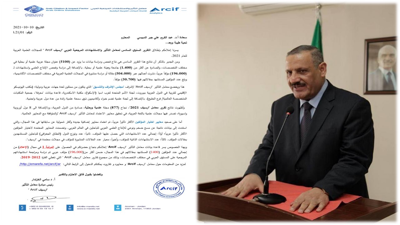 سرايا - حصل الباحث الدكتور عبدالكريم الدبيسي من كلية الإعلام بجامعة الشرق الأوسط، على المرتبة الأولى ضمن قائمة الـ 10 مؤلفين الأكثر تأثيرا في مجال علوم الإعلام والاتصال في العالم العربي، وفق التقرير السنوي 2021، لمعامل التأثير والاستشهادات المرجعية للمجلات العلمية العربية ارسيف.