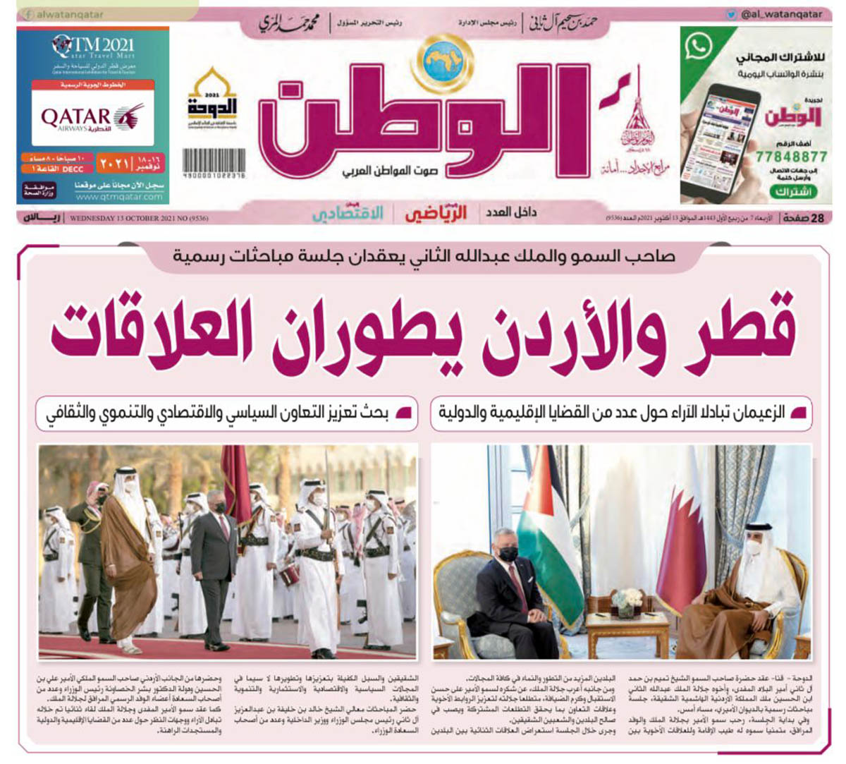 كما خصصت صحيفة الوطن عنوانها الرئيس على صفحتها الأولى للحديث عن العلاقات الأردنية القطرية تحت عنوان "قطر والأردن يطوران العلاقات".