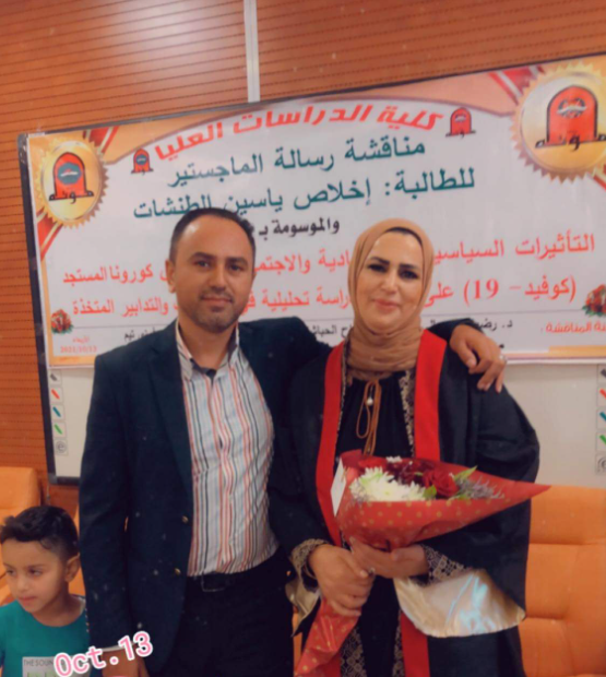سرايا - تتقدم الدكتورة أريج جبر بالتهنئة والتبريك للصديقة الغالية اخلاص ياسين الطنشات لحصولها على درجة الماجستير في العلاقات الدولية (قسم العلوم السياسية) من جامعة مؤتة بتقدير إمتياز مع مرتبة الشرف وذلك بعد مناقشة رسالتها، الموسومة ب( التأثيرات السياسية والاقتصادية والاجتماعية لفيروس كورونا المستجد (كوفيد 19) على الأردن: دراسة تحليلية في الإجراءات والتدابير المُتخذة)