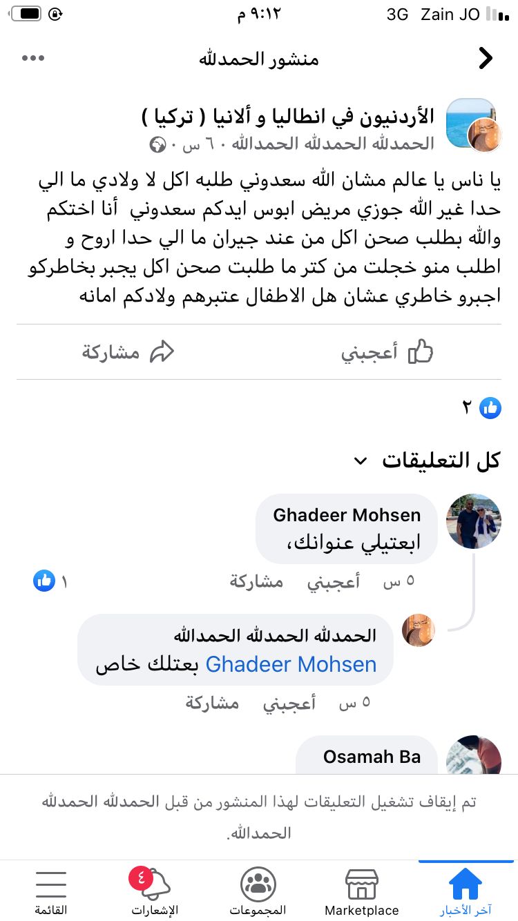 سرايا - لاقى بوست نشرته مواطنه على قروب اردنيون في انطاليا والانيا التركيه الكثير من ردود الفعل بعد ان فوجىء اعضاء القروب بقيام مواطنه يمكن ان تكون اردنيه ومسجله باسم ( الحمد لله الحمد لله ) مناشده لمساعدتها بعد نفاذ الطعام من منزلها