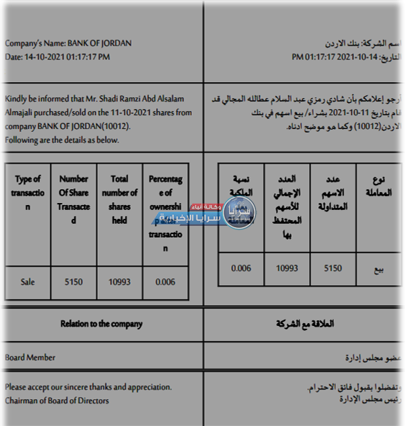 و تشير الوثيقة أن ""شادي رمزي - إسم مُركب" عبد السلام عطا الله المجالي عضو مجلس الإدارة في البنك قام بتاريخ 11/0/2021 ببيع أسهم في البنك الأردن و عددها 10012 سهماً، و بعد هذه العملية بقي للمجالي 10993 سهماً مع بقاء 0.006% كنسبة له في البنك.