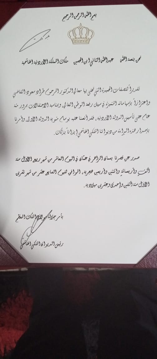 سرايا - جلالة الملك حفظه الله شرفنا اليوم بتكريم المرحوم والدي الدكتور طراد سعود القاضي بني خالد بوسام مئوية الدولة تسلمه أخي الدكتور ثائر ، فهذا ديدن آل هاشم اذ أستذكر حياة المرحوم والدي الذي هو من مواليد حوشا عام ١٩٣٦ حيث درس في الرمثا يذهب اليها سيرا بأقدام عارية