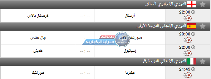 سرايا - تستضيف الملاعب الأوروبية اليوم الاثنين 18 - 10 - 2021، العديد من المباريات المهمة في مقدمتها مواجهة آرسنال ضد كريستال بالاس فى الدوري الإنجليزي وإسبانيول ضد قادش فى الدوري الإسباني .