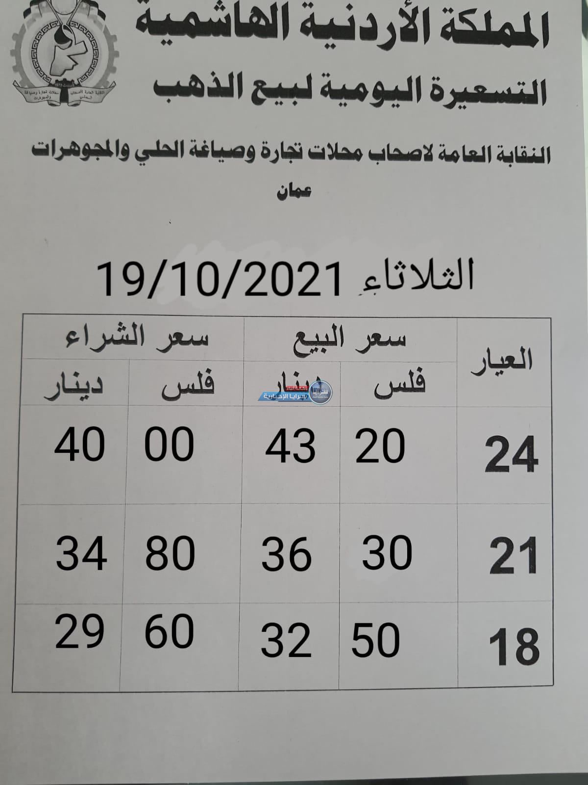 حيث جاء سعر بييع غرام الذهب عيار 24 محلياً 43.20 وسعر الشراء وصل الى 40.00، فيما وصل سعر بيع غرام الذهب من عيار 21 الى 36.30 وسعر الشراء وصل الى 34.80.