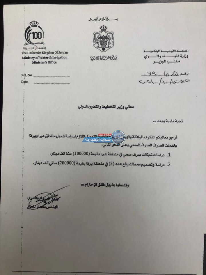 سرايا - أحمد الجراح - رفع وزير المياه والري المهندس محمد النجار كتابا يطلب خلاله من وزير التخطيط والتعاون الدولي الدكتور ناصر الشريدة بالإيعاز للجهات ذات العلاقة بالموافقة على تأمين التمويل اللازم لدراسة شمول مناطق عيرا ويرقا بخدمات الصرف الصحي.