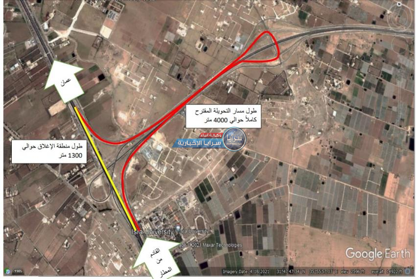 وأوضحت في بيان صحفي صادر عن وحدة الاعلام، أنه سيتم طيلة فترة الاغلاق اجراء فحوصات فنية للمقطع الواقع على طريق المطار الرئيسي بعد اسفل الجسر باتجاه عمان لمعالجة الهبوط الواقع في المقطع، ما تطلب من الوزارة وحفاظا على السلامة العامة اغلاق المقطع وتحويل حركة السير بشكل مؤقت لاجراء اللازم.