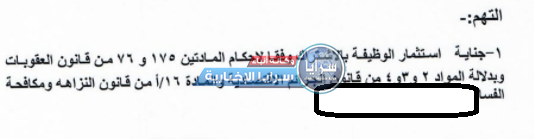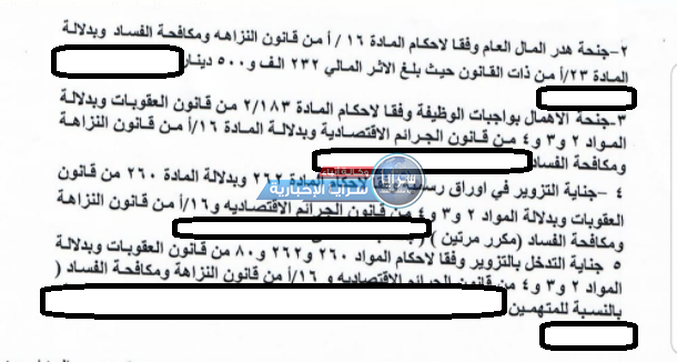 وكانت أولى الاتهامات على اللائحة؛ جناية استثمار الوظيفة بالاشتراك، إضافة إلى هدر المال العام بأثر مالي بلغ 232 ألفا و 500 دينار، وجنحة الإهمال بواجبات الوظيفة، وجناية التزوير لأوراق الرسمية، وجناية التدخل بالتزوير.