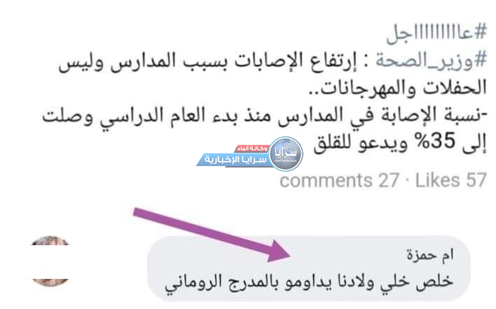سرايا - خاص - احرجت ام اردنية وزير الصحة فراس هواري، بتعليق ساخر لها عبر الفيسبوك، على تصريحاته الاخيرة حول أن ارتفاع اصابات كورونا في المملكة جاءت نتيجة دوام طلبة المدارس وليس بسبب الحفلات والمهرجانات.