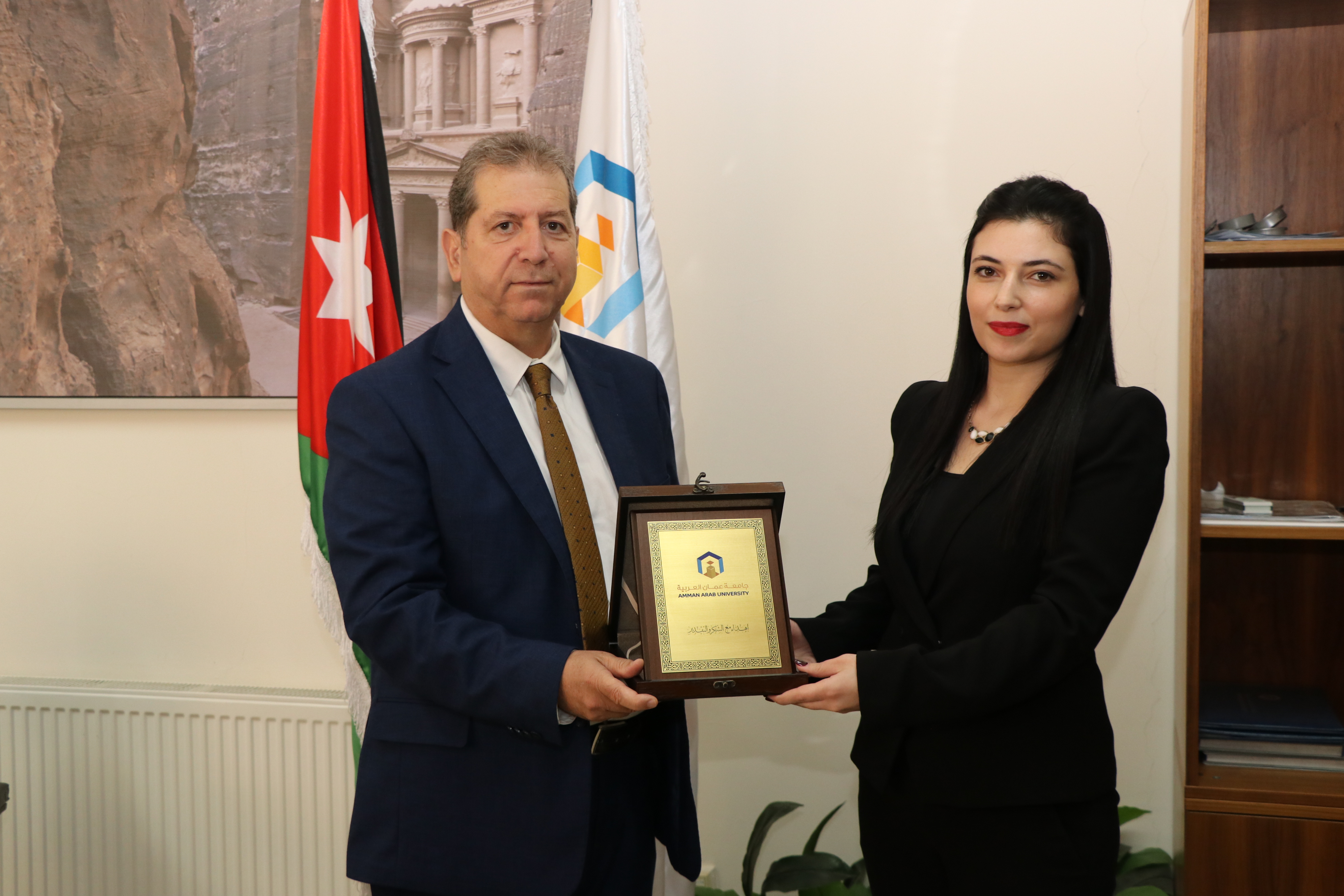 سرايا - استمراراً لنهج جامعة عمان العربية في متابعة خريجيها وتكريم المتميزين منهم وتأكيدا منها على اعتزازها بخريجيها وسفرائها المتميزين في الأردن والوطن العربي والعالم الذين نجدهم دوماً في الطليعة يتميزون بالنجاح والابداع والتميز وطنياً وإقليمياً، قام رئيس جامعة عمان العربية الأستاذ الدكتور محمد الوديان بتكريم خريجة الجامعة المحامية رندة محمد عطوة وهي خريجة كلية القانون في جامعة عمان العربية/ ماجستير القانون العام مباركاً لها الإنجاز الكبير بتعيينها سفيرة السلام للنوايا الحسنة لدى المركز العربي الأوروبي لحقوق الانسان والقانون الدولي والذي جاء خلال فعاليات المؤتمر الدولي لقادة المجتمع الذي عقد في دولة الإمارات العربية المتحدة/ دبي مؤخراً. وقد حضر التكريم كل من نائب رئيس الجامعة للشؤون الأكاديمية الأستاذ الدكتورة إخلاص الطراونة وعميد كلية القانون الأستاذ الدكتور مهند أبو مغلي وعميد شؤون الطلبة الدكتور خالد بني حمدان إلى جانب أفراد من أسرة الآنسة رندة.