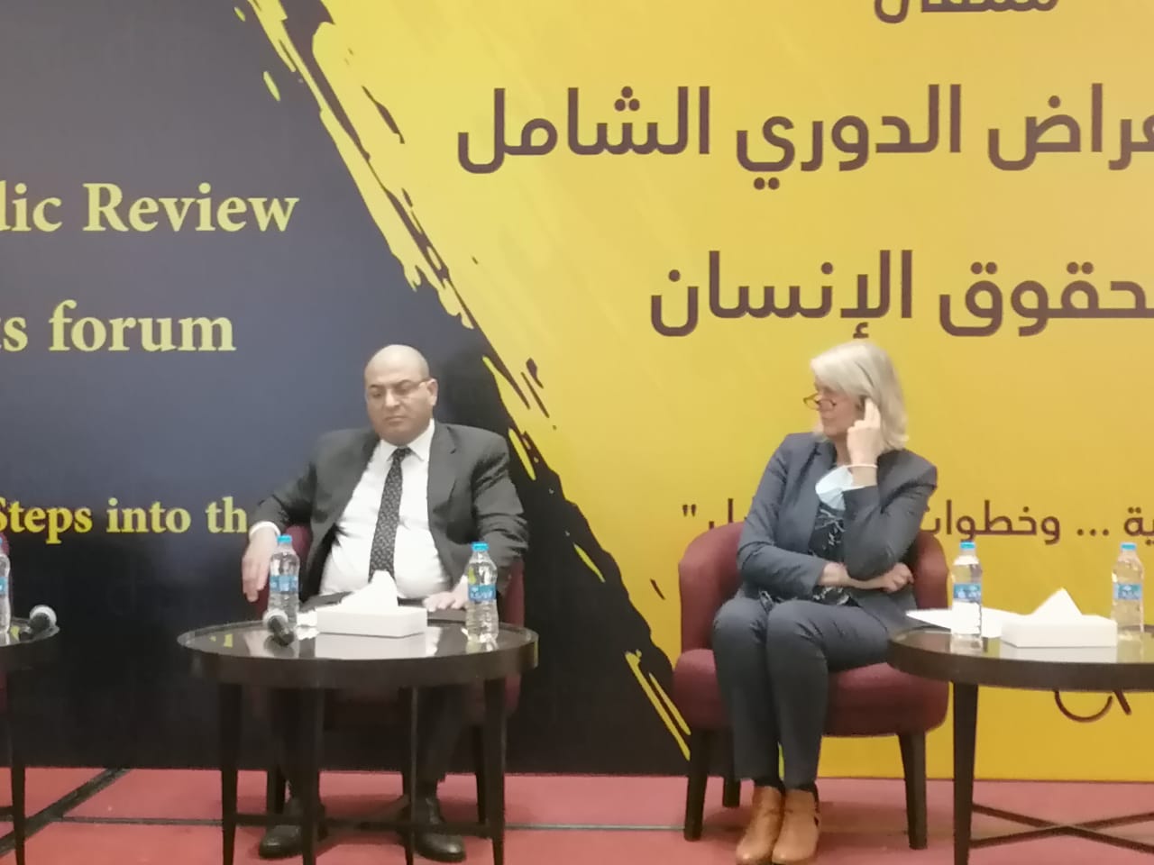 وخلال الجلسة الأولى التي عرضت التوصيات التي قبلها الأردن في الاستعراض الدوري الشامل عام 2018، قدم المحامي معاذ المومني موجزا عن حالة إنفاذ التوصيات، مستندا إلى تقرير رقابي أصدره مركز حماية وحرية الصحفيين حمل عنوان "التزامات تنتظر التنفيذ"، مشيرا إلى غياب الآلية التشاورية بين الحكومة والمجتمع المدني خاصة خلال العامين الأخيرين.