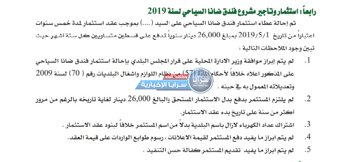 1. لم يتم إبراز موافقة وزير الادارة المحلية على قرار المجلس البلدي بإحالة استثمار فندق ضانا السياحي على المذكور اعلاه خلافا لأحكام المادة (57) من نظام اللوازم واشغال البلديات رقم (70) لسنة 2009 وتعديلاته المعمول به حينها.