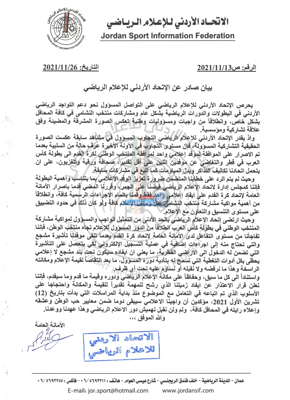 وأعلن الاتحاد الأردني للإعلام الرياضي اعتذاره عن ايفاد احد مندوبه، الذي رشح لمهمة مرافقة المنتخب الوطني لكرة القدم الى بطولة كأس العرب في قطر، احتجاجا على الأسلوب الذي تم اتباعه في التعامل مع الموضوع منذ بداية المراسلات التي بدأت بتاريخ (12) تشرين الأول 2021.