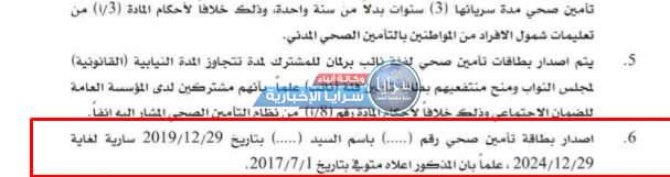 وجاء في التقرير الذي اطلعت عليه "سرايا"، انه ولدى تدقيق قيود وسجلات مديرية المشتركين / ادارة التأمين الصحي للفترة 2018،2019 ، تبين بانه تم إصدار بطاقة تأمين صحي لأحد الاشخاص بتاريخ 29/12/2019 سارية لغاية 29/12/2024، علماً بان الشخص متوفي بتاريخ 1/7/2017.