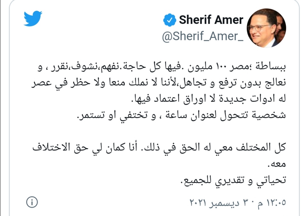 وأضاف: "كل المختلف معي له الحق في ذلك. أنا كمان لي حق الاختلاف معه. تحياتي وتقديري للجميع".
