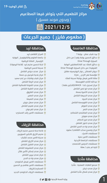 ووفق وزارة الصحة تتوفر مطاعيم “فايزر” للجرعة للأعمار من 12 عاما فما فوق، ومرافقة ولي الأمر للفئة العمرية من 12 عاماً إلى ما دون 18 عاماً لأخذ موافقته الخطية على تطعيم أبنائه، والجرعة الثانية للمواعيد المبرمجة مسبقا ومن تخلف عن أخذ الجرعة الثانية، والجرعة الثالثة لمن أمضى 6 أشهر على تلقيه الجرعة الثانية وللعمر 18 سنة فما فوق.