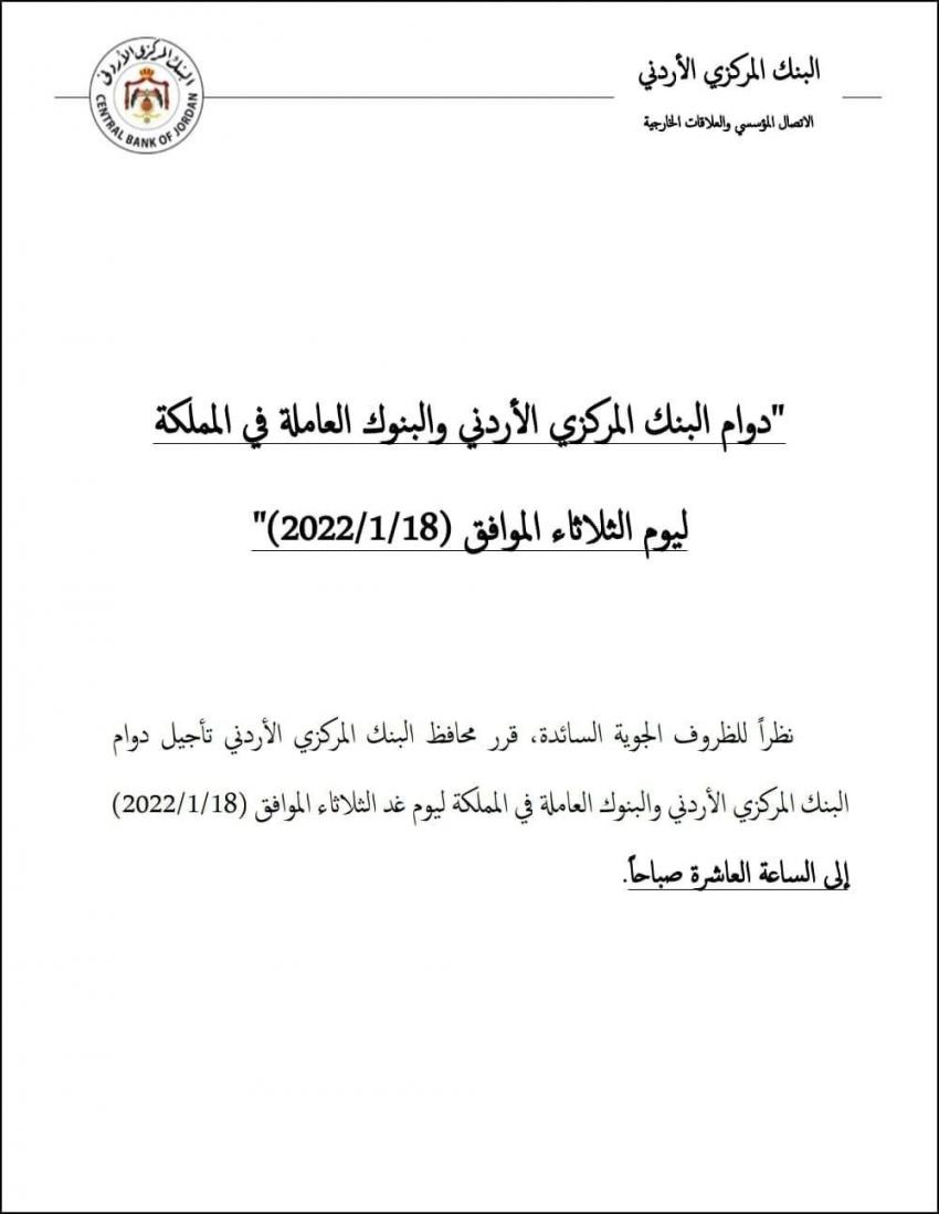 ويأتي قرار البنك المركزي نظرا للظروف الجوية السائدة وحفاظا على سلامة المواطنين نتيجة تدني درجات الحرارة إلى ما دون الصفر يوم غد الثلاثاء.