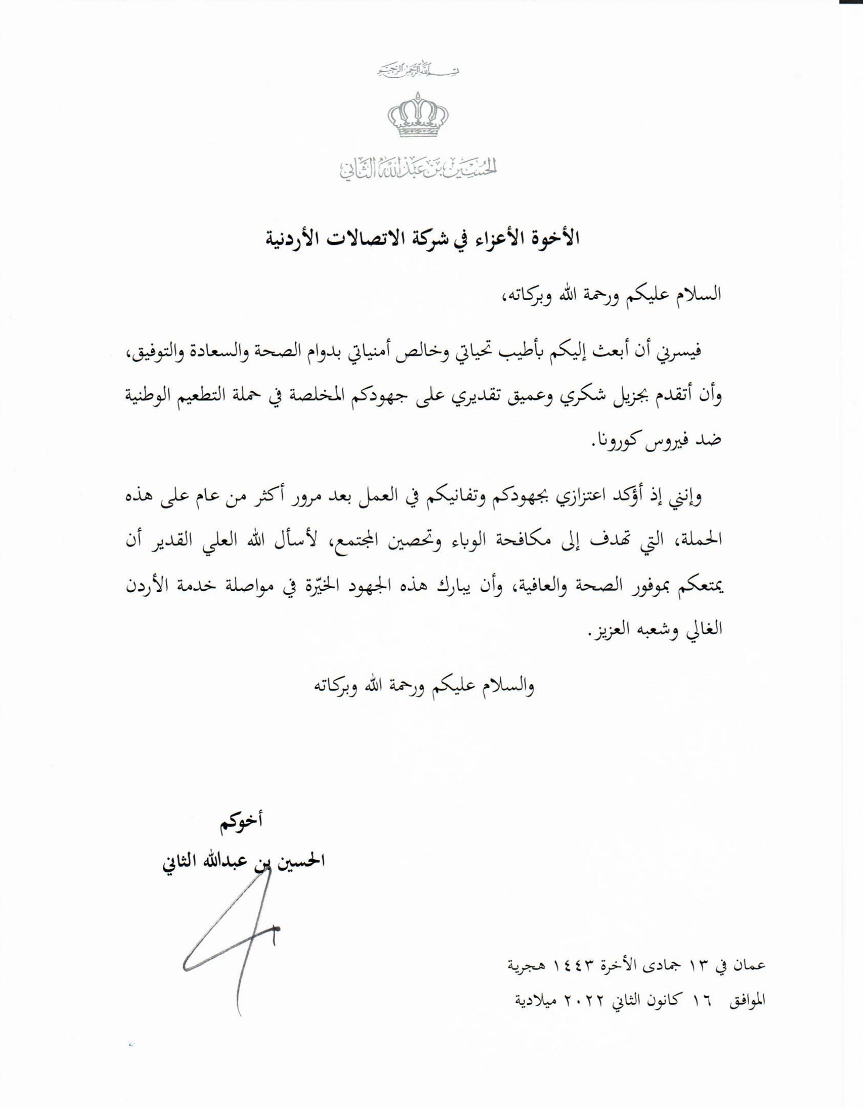 سرايا - تلقّت أورنج الأردن كتاب شكر من صاحب السمو الملكي ولي العهد الأمير الحسين بن عبدالله الثاني تقديراً للجهود التي بذلتها الشركة في حملة التطعيم الوطنية ضد فيروس كورونا.