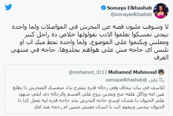 وأعادت سمية الخشاب نشر صورة لها مصحوبة بتعليق غير لائق وردت الخشاب على المتحرش، عبر حسابها الشخصي بموقع التواصل الاجتماعي (تويتر) كاتبة: "لو أنا ماشية في الشارع وفكرت تقربلي هعلمك إزاي تبقى راجل يا دكر"، وفق(ليالينا)