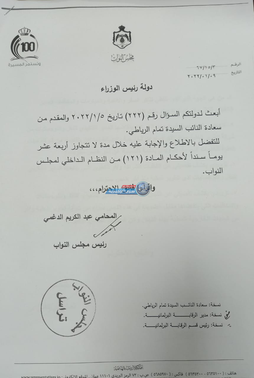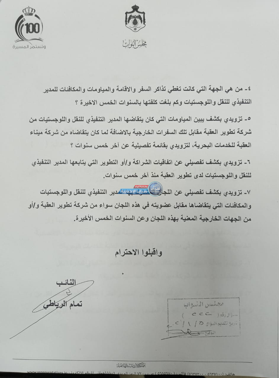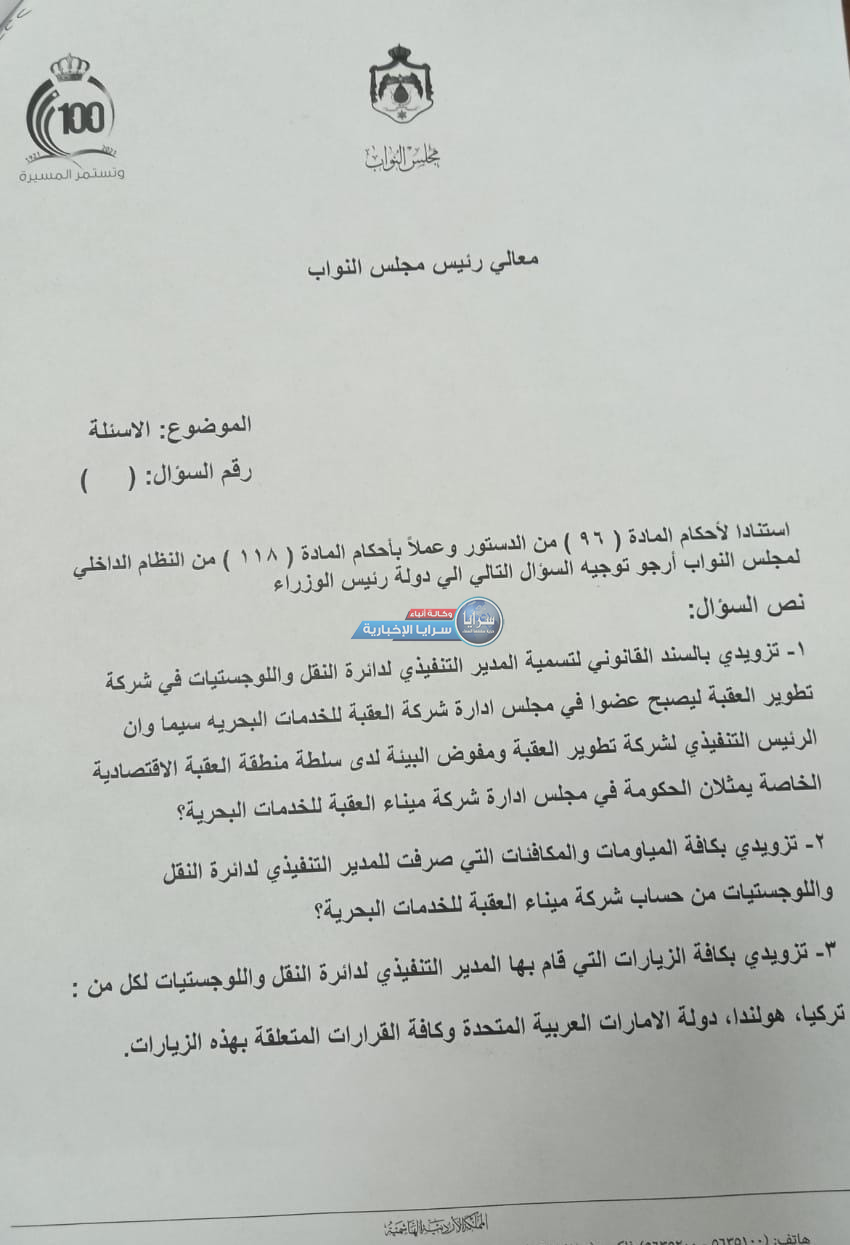 سرايا - سرايا - العقبة - يوسف الطورة – وجهت النائب تمام الرياطي أسئلة برلمانية سعيا لإزاحة الضبابية عن العديد من الملفات المتعلقة بمديرية النقل واللجوستيات في شركة تطوير العقبة ، ابرزها تسمية مديرها عضوا في مجلس إدارة شركة العقبة للخدمات البحرية ، إلى جانب حجم المياومات والمكافآت ، وكلف نفقات السفريات لعدد من الدول العربية والغربية ، واستفسارات أخرى.