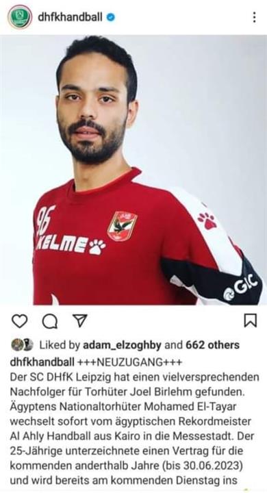 سرايا - أعلن نادى ليزبرج الألماني، عن التعاقد مع حارس مرمى منتخب مصر والنادي الأهلي لكرة اليد محمد عصام الطيار، في الفترة الحالية.