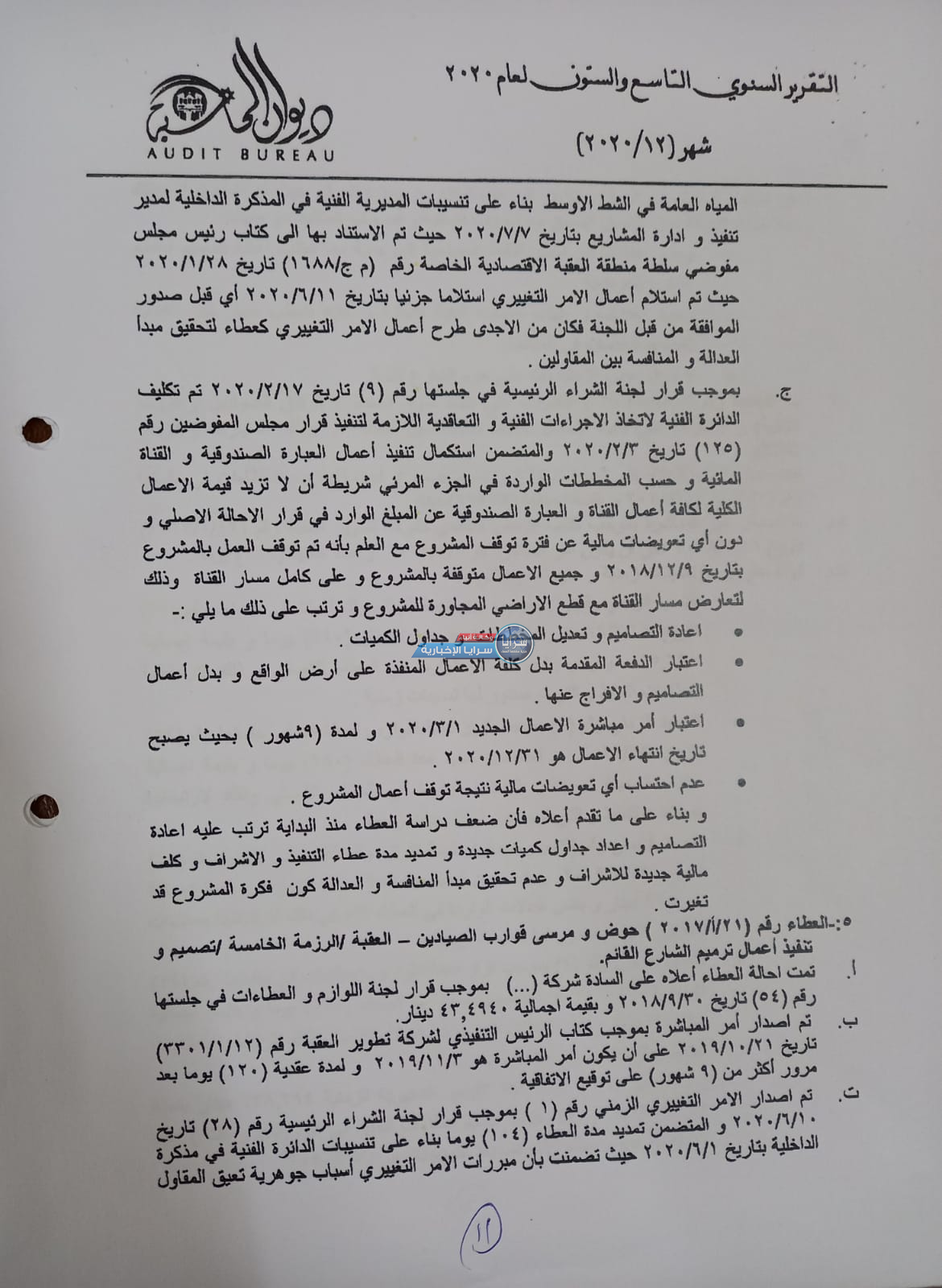 مبينا اصدر أمر تغييري مالي بقيمة 87.375 دينار بنسبة 4.46 % من قيمة العطاء لتنفيذ مرافق غير واردة في العطاء عند الإحالة ، الأمر الذي غيب تحقيق العدالة والمنافسة بين المقاولين ، إضافة إلى توقف العمل بالمشروع ومنح المقاول 9 أشهر إضافية باعتبار أمر مباشرة العمل في الأول من آذار 2020 ، واعتبر انتهاء الأعمال في اليوم الأخير من العام نفسه ، الأمر الذي فرض إعادة التصاميم وتعديل المخططات وجداول الكميات ، واعتبار الدفعة المقدمة بدل كلفة الأعمال المنفذة على الواقع وبدل التصاميم والإفراج عنها.