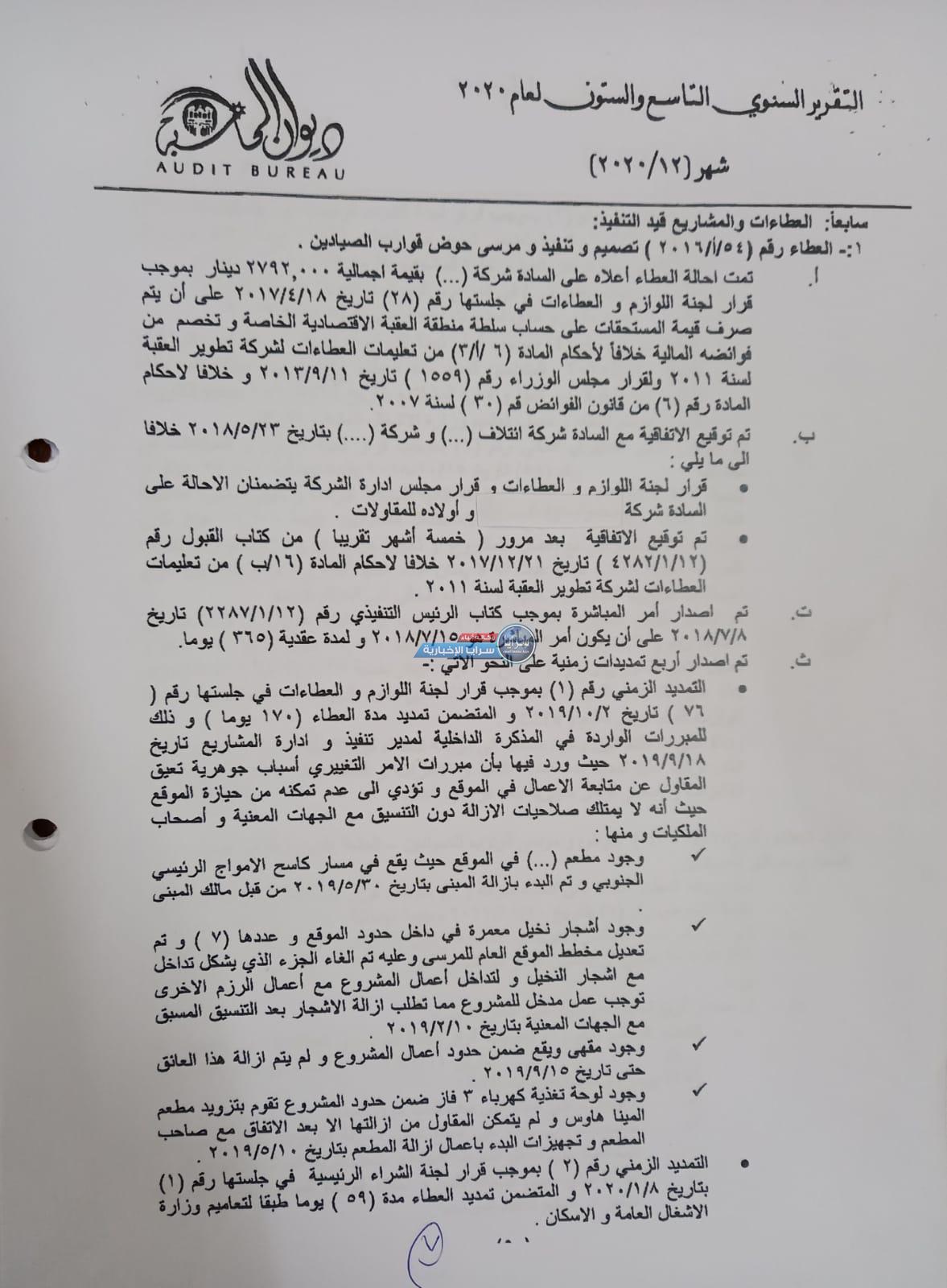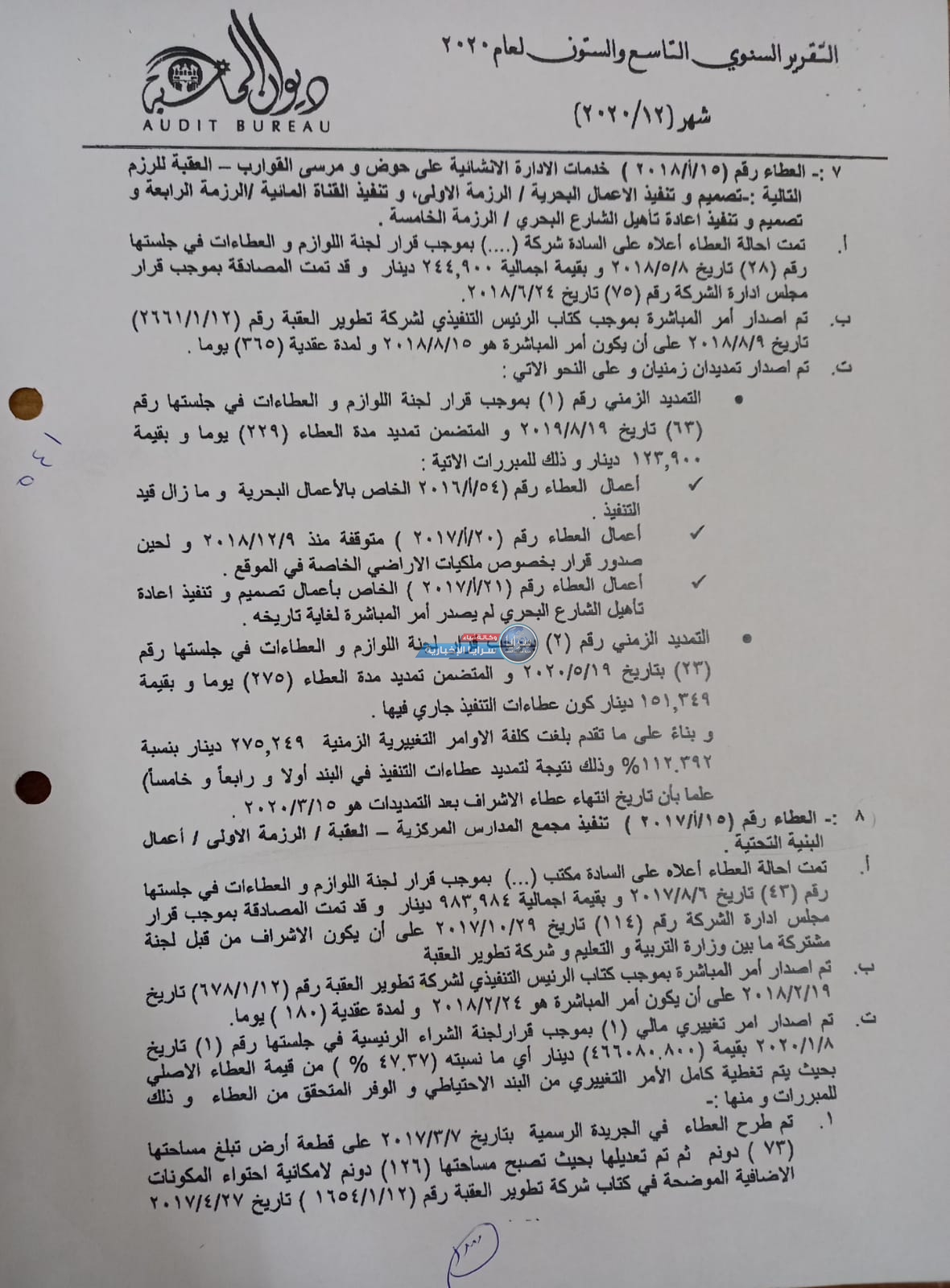 وفي التفاصيل أحيل عطاء تصميم وتنفيذ مرسى قوارب الصيادين بقيمة إجمالية 2792.000 مليون دينار بمدة عقدية 365 يوما ، منتصف نسيان 2017 ، وإقرار الاتفاقية بعد خمسة أشهر من الإحالة الأمر الذي وصفه بالمخالف ، على أن يتم صرف المستحقات على حساب سلطة العقبة الخاصة وتخصم من فوائضه المالية ، خلافا لاحكام المادة ( 6/أ/ 3 ) من تعليمات العطاءات لشركة تطوير العقبة والمادة " 6 " من قانون الفوائض رقم 30 لسنة 2007.